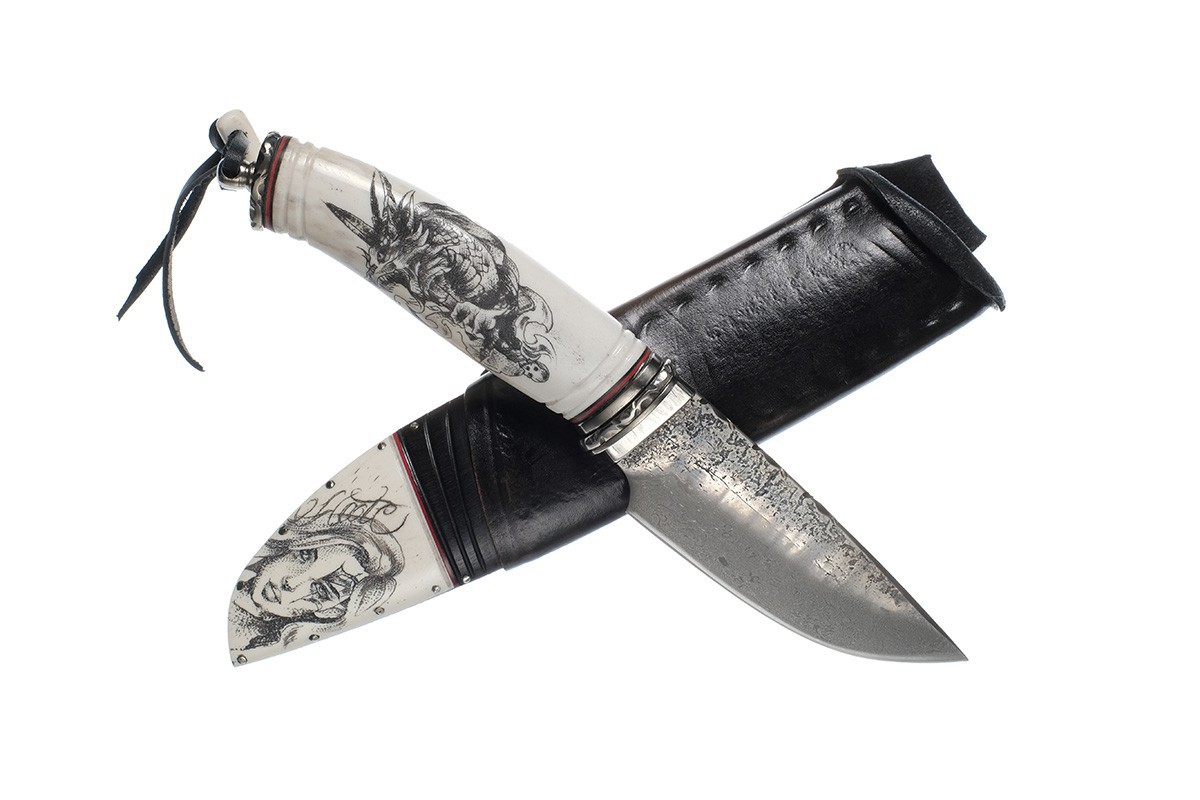 | Материал ножен: | черный граб, рог лося, кожа, скримшоу |