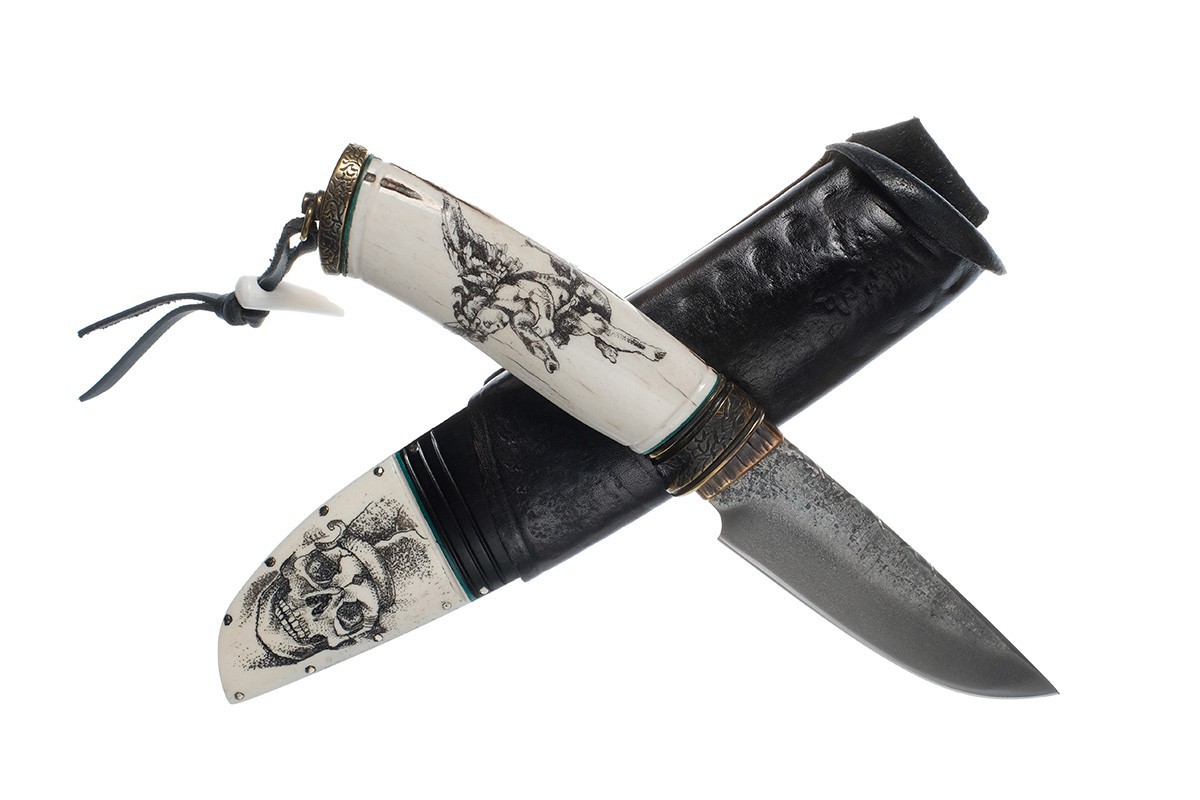 | Материал ножен: | черный граб, рог лося, кожа, скримшоу |