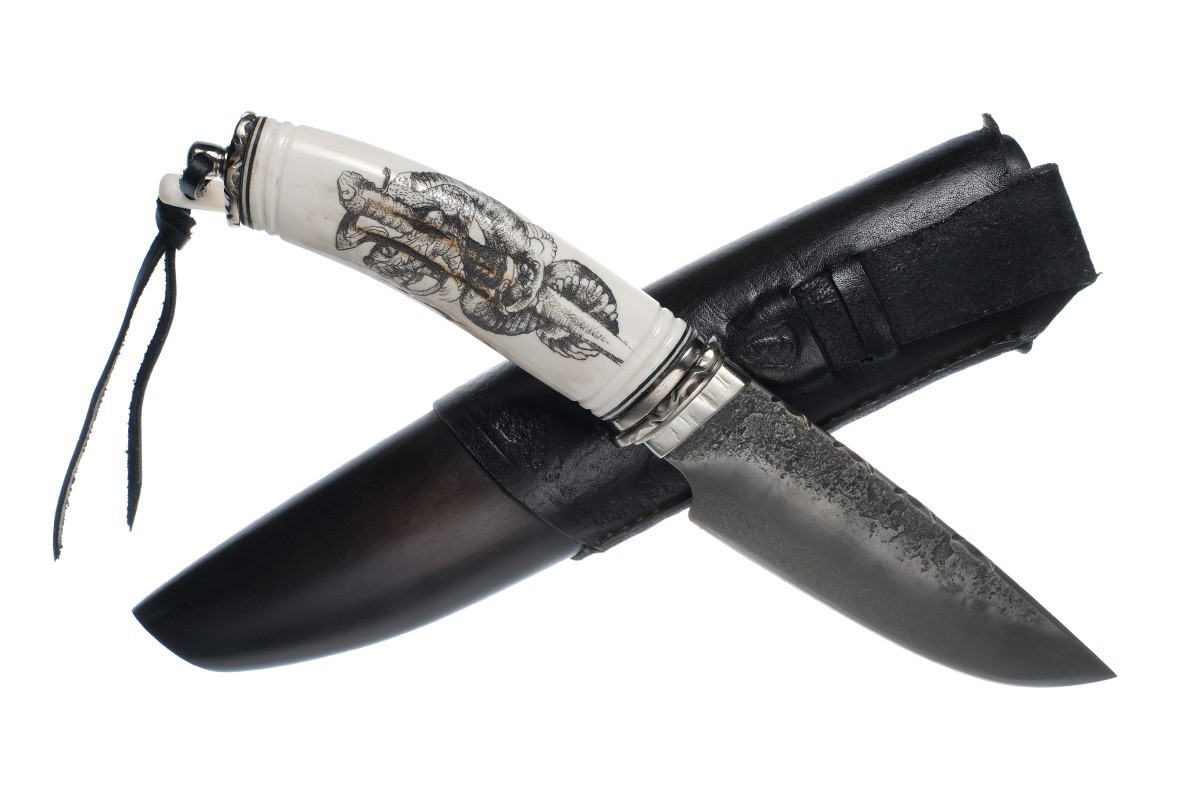 | Материал ножен: | черный граб, рог лося, кожа, скримшоу |