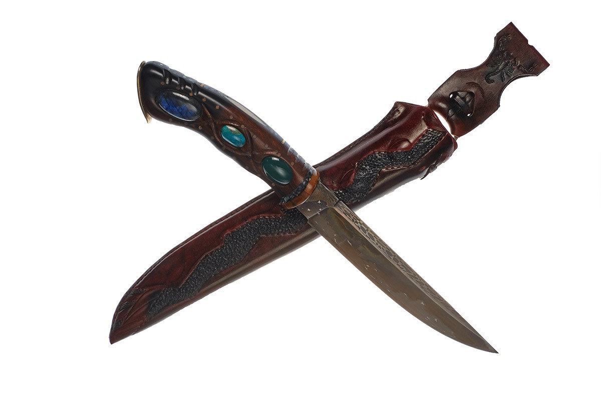 Описание рукояти: Мокуме, айронвуд, стаб. мамонт, голубой агат, лабрадор, бирюза, перламутр