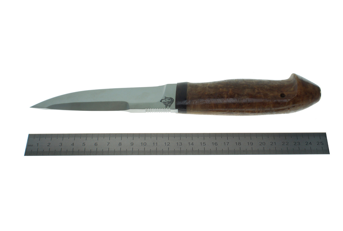 Универсальный легкий и прочный нож с мощным и изящным клинком, имеющим приспущенный обушок. При толщине пяты в 5 мм, за счет широкого фальшлезвия, не доходящего до острия 15 мм и широких плавных обратнолинзовидных спусков, клинок получился легким, с отличными режущими качествам. На обухе клинка у рукояти есть насечка для резов с упором большого пальца в обушок. Нож прекрасно сбалансирован. Эргономичная форма рукояти в скандинавском стиле уверенно и прочно ложится в любую ладонь, даже в рукавице. Небольшая подпальцевая выемка не дает соскользнуть пальцам при резах от себя. Монтаж рукояти всадной, неразборный. На рукояти ближе к навершию есть отверстие под темляк. Отличный выбор для большинства видов работы в лесу.